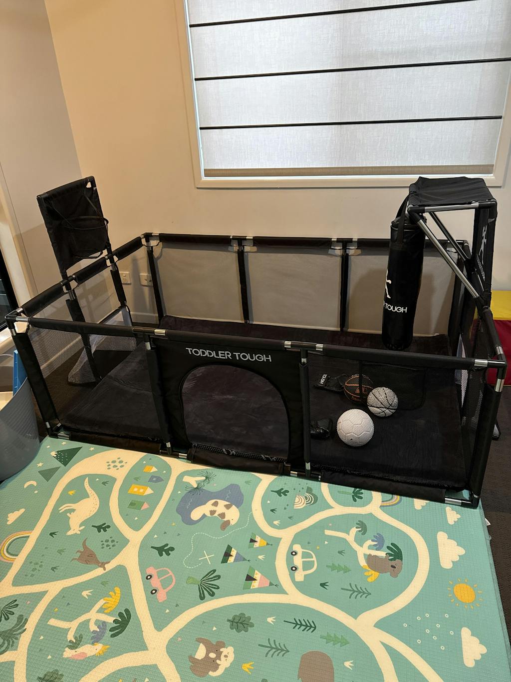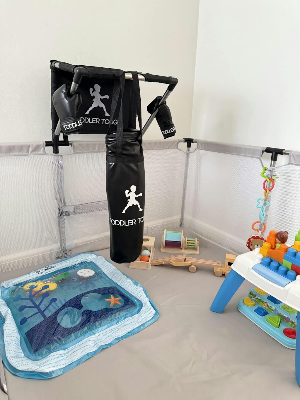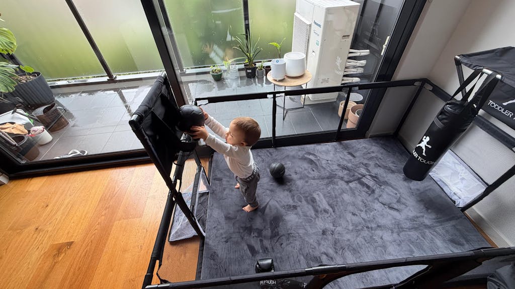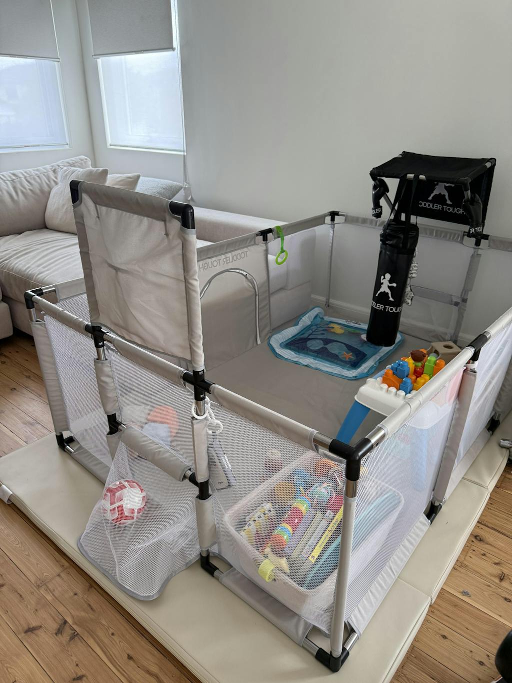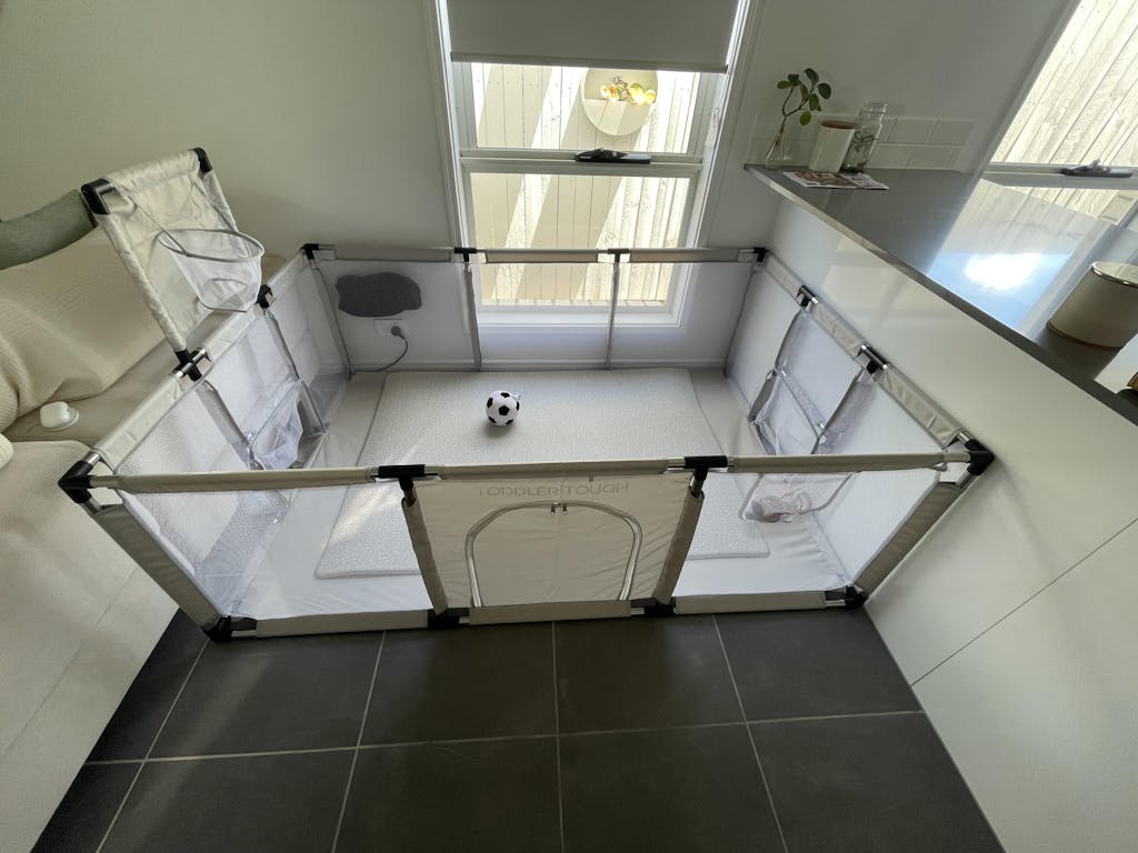 After researching extensively, I was initially leaning towards a basic mesh playpen since my son loves swinging on his cot, and a wooden playpen wasn’t a viable option. Fortunately, I discovered Toddler Tough! I bought the grey version to match my beige living room, and it blends perfectly. I love this playpen for its durability, easy cleaning (just spray and wipe), and the fact that it will grow with my son's abilities. He enjoys crawling around freely and safely, and he's starting to stand and reach the top rail. Soon, he’ll be shooting hoops, punching the boxing bag, and kicking goals. I appreciate that I won’t need to upgrade as he grows. Highly recommend—it's also lightweight and perfect for moving outside on warmer days.