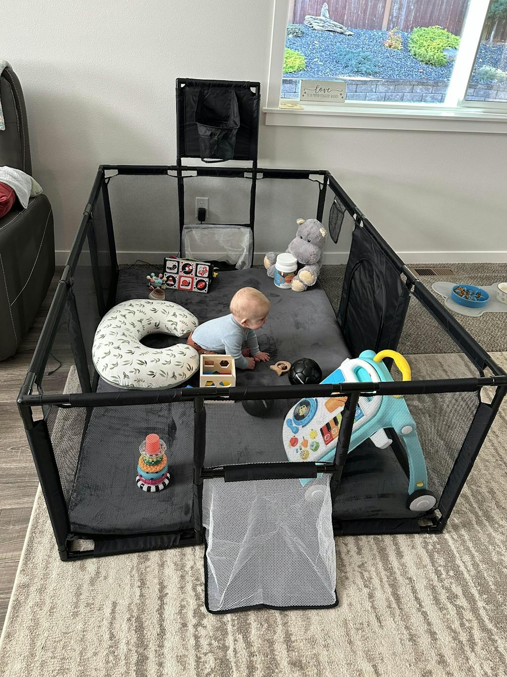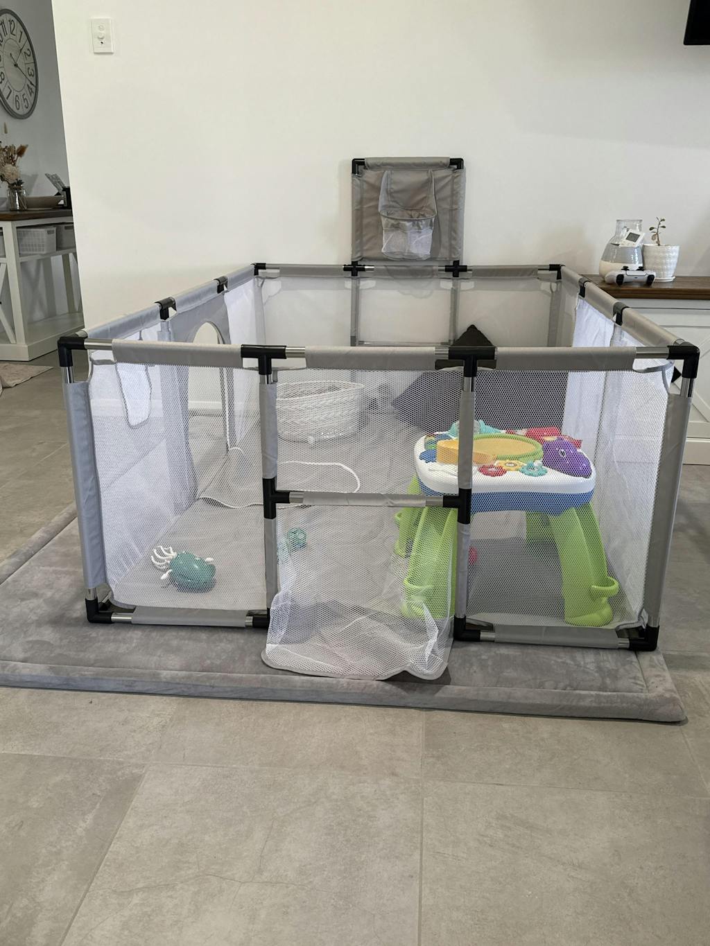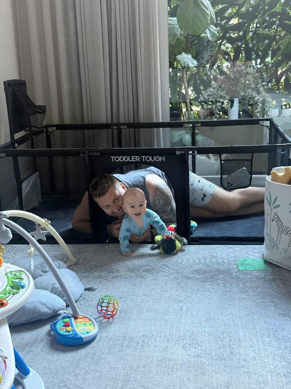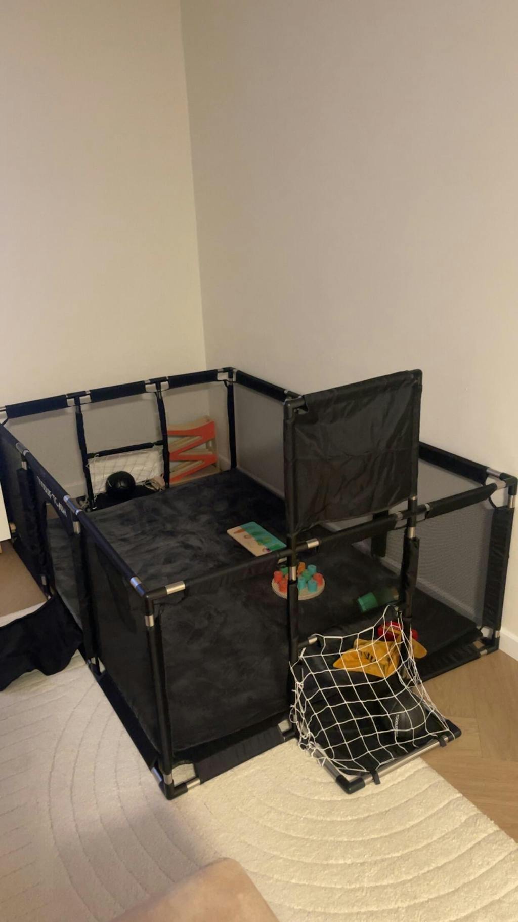 After researching extensively, I was initially leaning towards a basic mesh playpen since my son loves swinging on his cot, and a wooden playpen wasn’t a viable option. Fortunately, I discovered Toddler Tough! I bought the grey version to match my beige living room, and it blends perfectly. I love this playpen for its durability, easy cleaning (just spray and wipe), and the fact that it will grow with my son's abilities. He enjoys crawling around freely and safely, and he's starting to stand and reach the top rail. Soon, he’ll be shooting hoops, punching the boxing bag, and kicking goals. I appreciate that I won’t need to upgrade as he grows. Highly recommend—it's also lightweight and perfect for moving outside on warmer days.