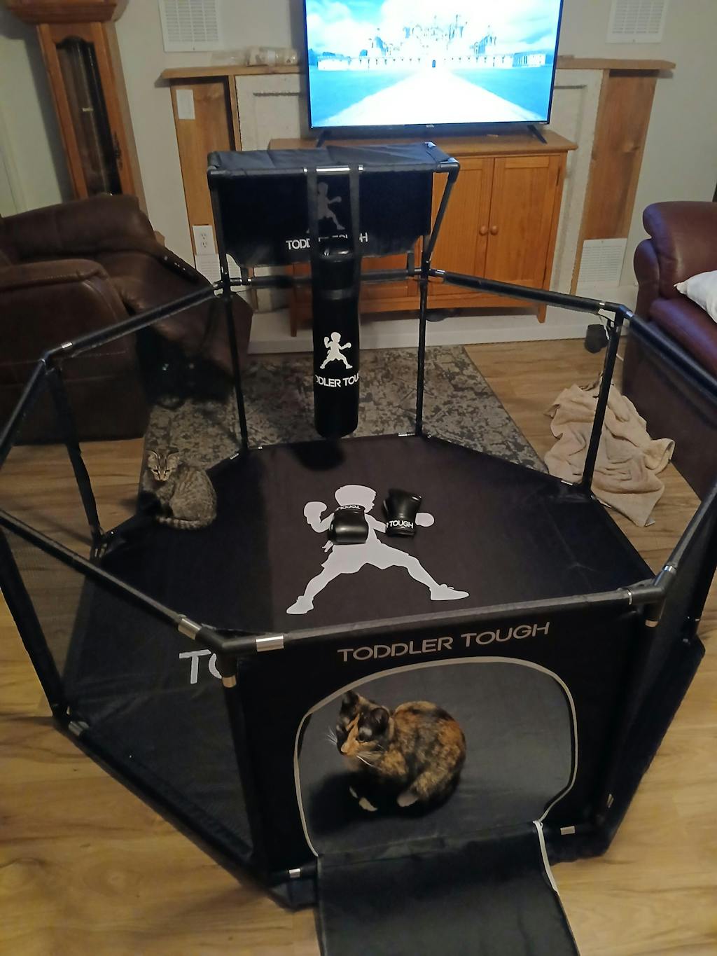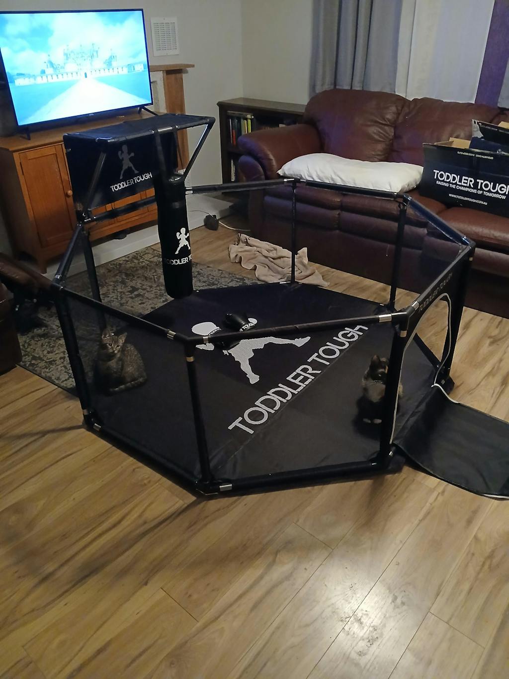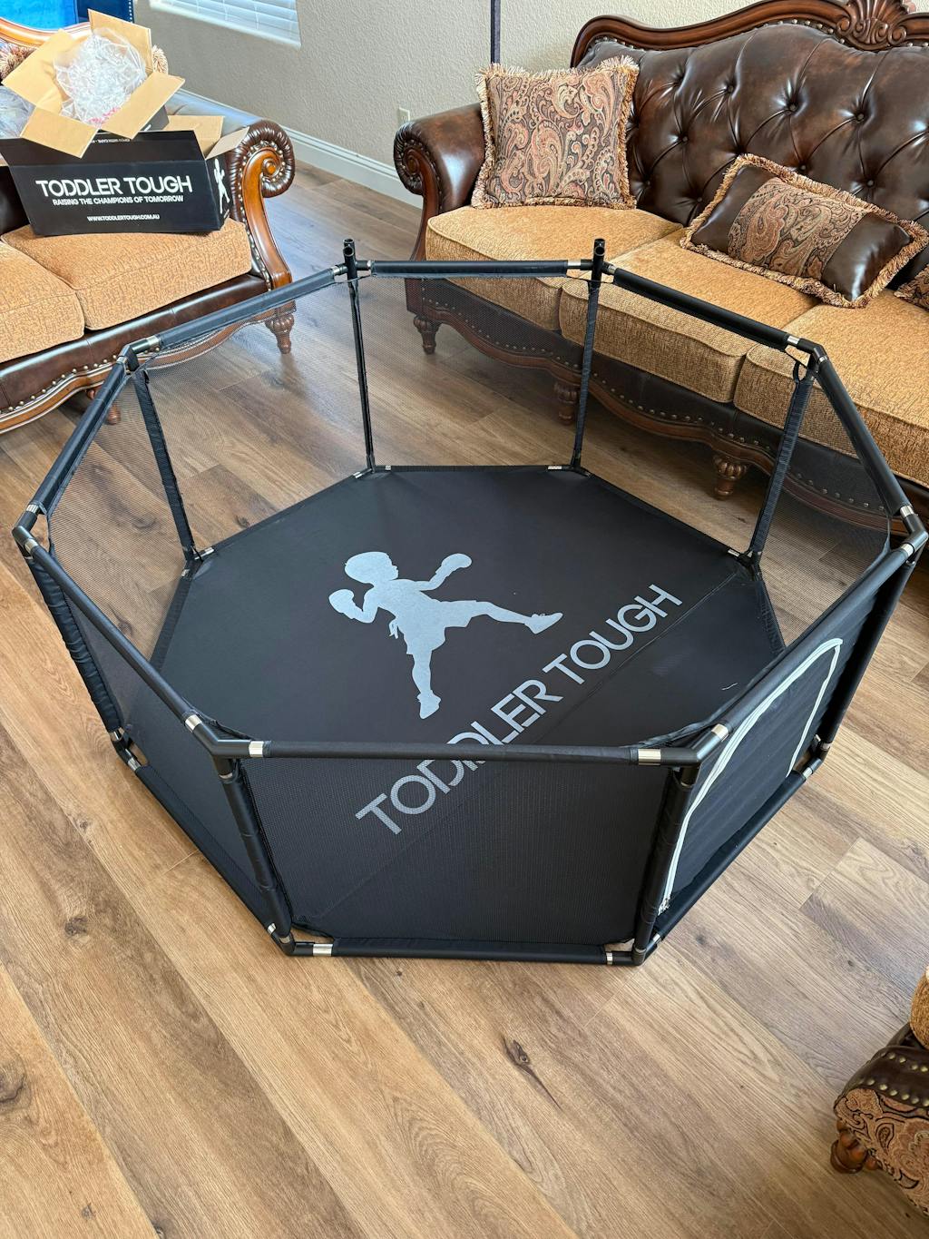 I am very happy with the Toddler Tough play pen. The assembly was super easy, shipping was fast & I love that I was able to choose a colour that will fit with my lounge room. The reasons it didn’t get 5 stars is because I wish it was bigger. My twin boys won’t fit in it for long. Plus you can’t buy a second pair of boxing gloves. Will have to find another set somewhere else.