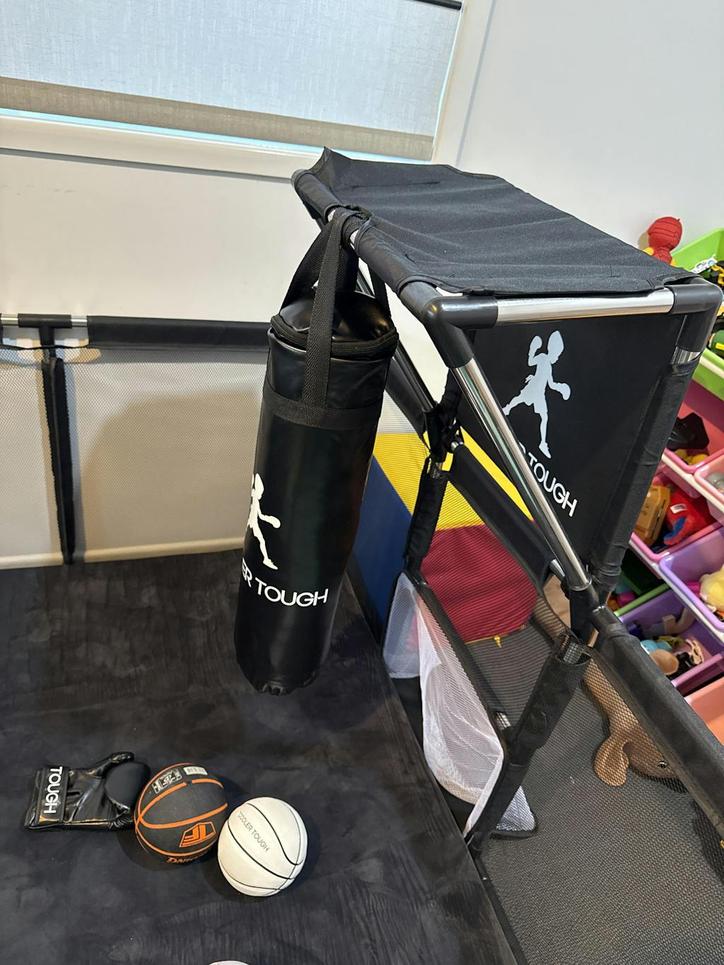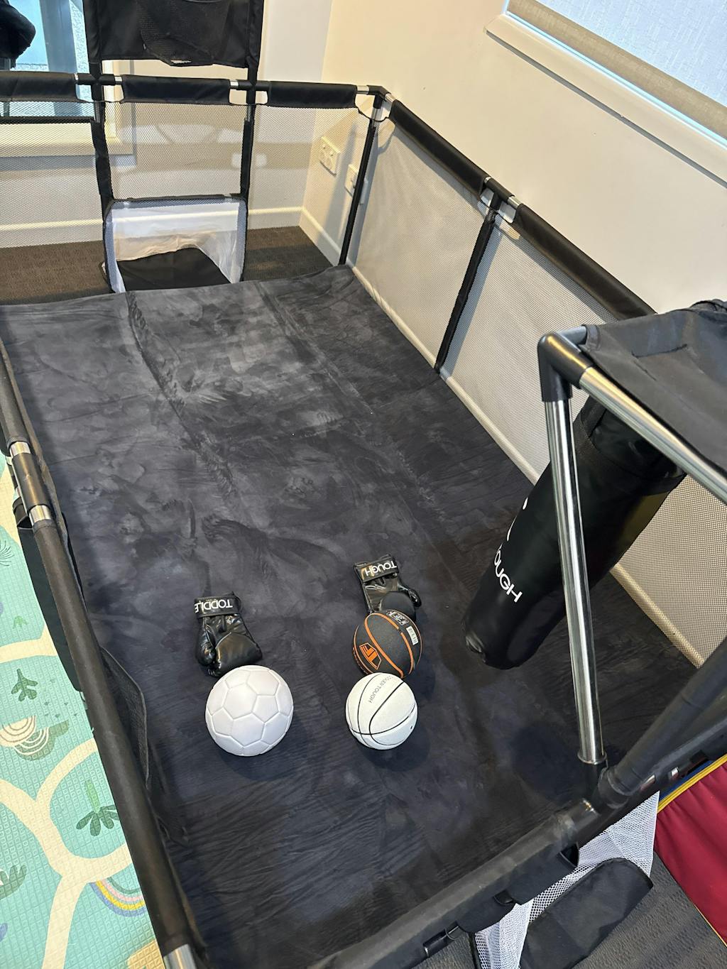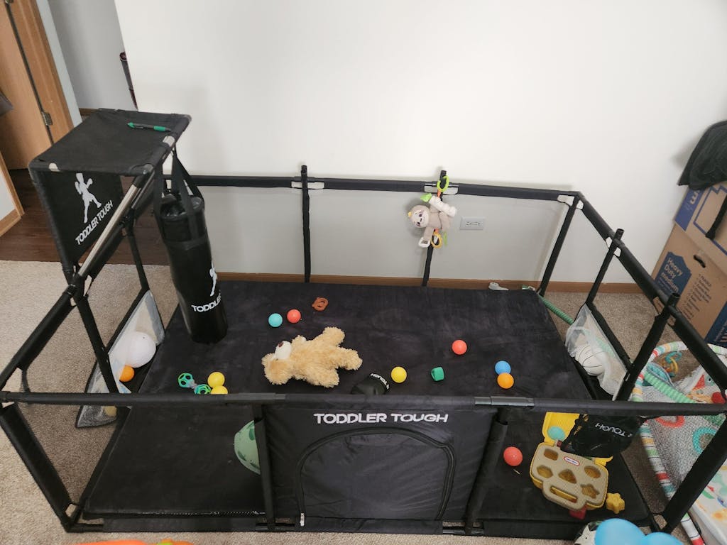 We’ve had the Toddler Tough play pen for 6 months now and I can say after a few playpens that this is the only one my toddler doesn’t want to escape from. The basketball hoop and boxing bag are pretty sturdy and the mat is very plush, perfect if you have the playpen on hardwood. The boxing gloves and balls are surprised very good quality for a kids set. On the pricier side but worth the quality.